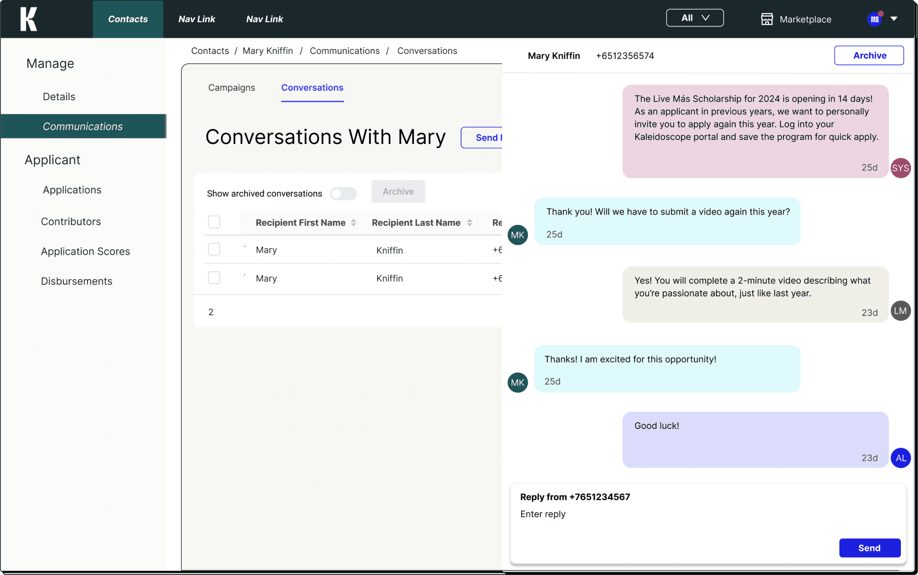 With Kaleidoscope’s SRM tools, staff can easily view message history, ensuring consistency in applicant communication, even if multiple people step in or trade out during the holidays.