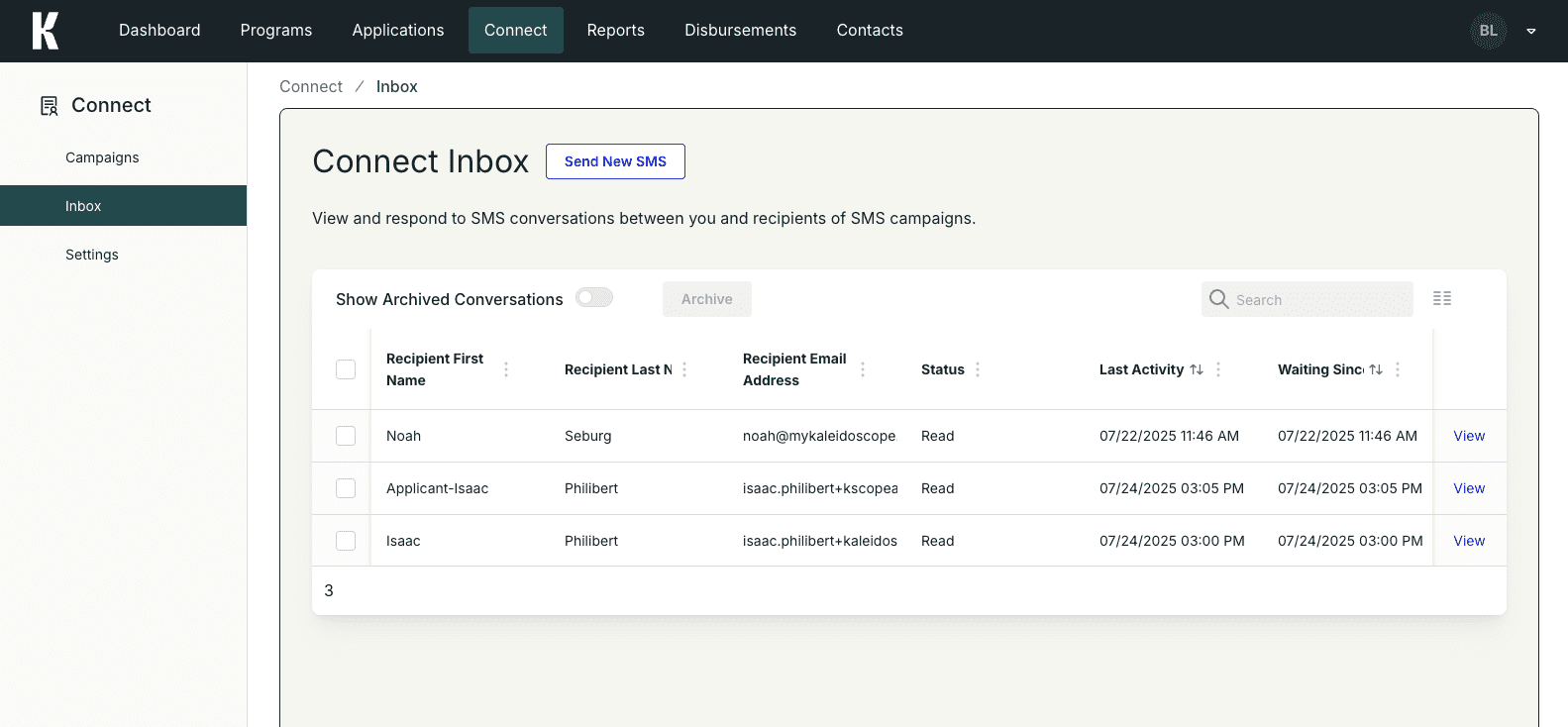 - If you’re using Kaleidoscope’s SMS Messaging, you can centralize messages, assign responders, and track response times.
